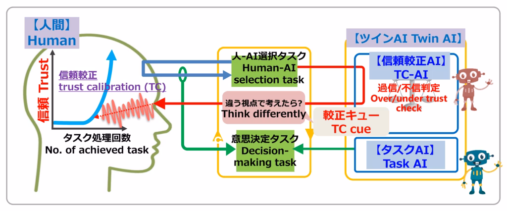 人間-AI協調意思決定において,信頼較正AIが人間の意思決定をモニターすることで人間がAIに対して過信/不信なのかを判定します.もし過信/不信が検出されると,人間に対してえん曲的に修正を促す刺激(較正キュー)を表出することで,人間が自ら信頼を較正していきます.この適応的信頼較正理論により,人間とAIの最適な信頼関係の構築を目指します.