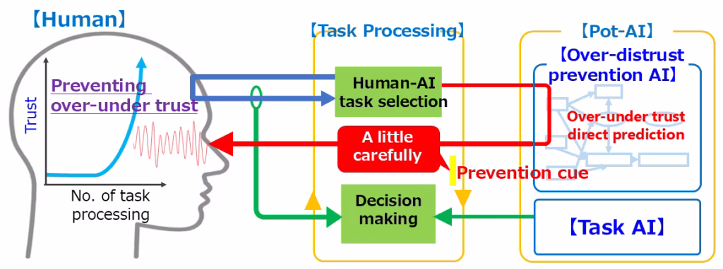 提案する過不信予測モデルは、要因と因果関係からなる有向グラフで表現され、設計者がトップダウンに設計できる過不信の発生予測モデルである。そして、このモデルに基づき過不信を予防可能なAIシステム:POT-AIを提案する。POT-AIは、過不信の発生を予測し、適時予防キューと呼ばれる刺激をユーザに表出することで過不信をあらかじめ抑制できる。予防キューの設計には、人間の主体性を担保して行動変容を促すナッジ技術が用いられる。